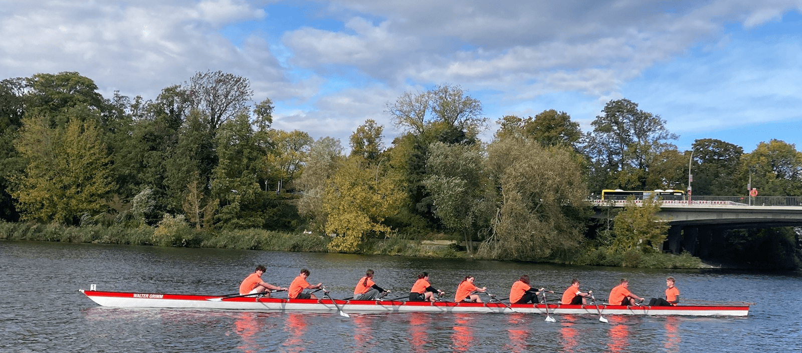 An einem sonnigen Herbstmittwoch nahmen die Schülerinnen und Schüler unseres Gymnasiums an der diesjährigen Schüler/innen-Regatta im Rudern am Wannsee teil. Bei nahezu Windstille und durchgehendem Sonnenschein startete unser Ruderprojekt 9/10 in verschiedenen Bootsklassen. In der Ausscheidung der Juniorinnen konnte unser Boot direkt das erste Rennen für sich entscheiden. Auch das Jungs-Boot fuhr in einem Lauf den zweiten Platz ein. Höhepunkt war zweifellos der abschließende Lauf im Doppelachter, was für alle eine Prämiere darstellte. Unser Boot fuhr einen tollen dritten Platz ein.
